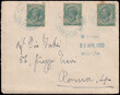 POSTA ANTIBOLSCEVICA. Lettera affrancata con 3 francobolli da 5 centesimi spedita da Roma per città ed annullati con il bollo a doppio cerchio "Unione Popolare Antibolscevica * ROMA" e datario su 3 righe "W. L'Italia 22APR. 1920 *ROMA*", unitamente a frammento affrancato col 5 centesimi. Certificato Raybaudi (1984)