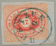 1866/68, 17 kr, scarlet, with a neatly strike of RUSTZUK in blue, line perf 12, on piece, very fresh and desirable, XF! Estimate 600€.