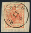 Österreich, 1850, Oberösterreich, ROHRBACH, 30 p, zartklarer Abschlag des Einkreisstempels auf 3 M III, rot, auf frischem Prachtbriefstück!