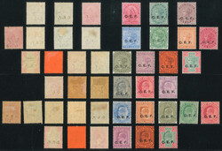 英國在華軍郵一組二十二枚新票,貼紙帶原膠,包含維多利亞女皇1900及1904全套,愛德華七世1904年缺三派士鐵灰色,另1909年一套兩枚